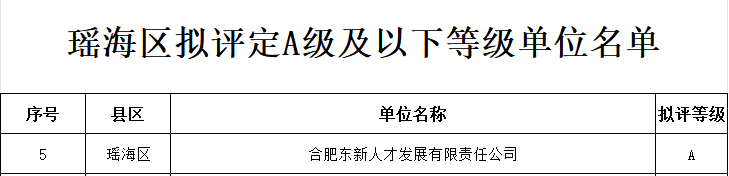 近日,瑶海区人力资源和社会保障局对2024年度劳务派遣单位信用评价拟评定A级及以下等级结果进行公示,经过单位自评、审核评价、社会公示和等级评定等严谨程序,合肥东新人才发展有限责任公司凭借规范管理、优质服务和卓越信誉,成功获评“A级信用单位”。