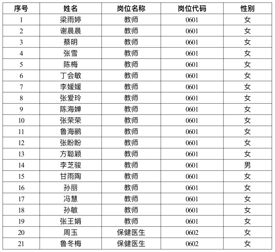 根据《合肥瑶海学前教育有限公司2025年第二批次公开招聘公告》(2025-06-20)规定,经过网上报名、资格初审、笔试、资格复审、面试、体检考察等程序,现将拟聘人员名单公示如下: